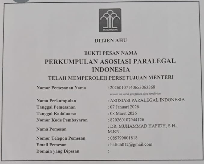 Disampaikan bahwa nama organisasi ASOSIASI PARALEGAL INDONESIA (API) telah diproses melalui notaris dan menunggu verifikasi legalitas untuk diteruskan ke Kementerian Hukum dan HAM.